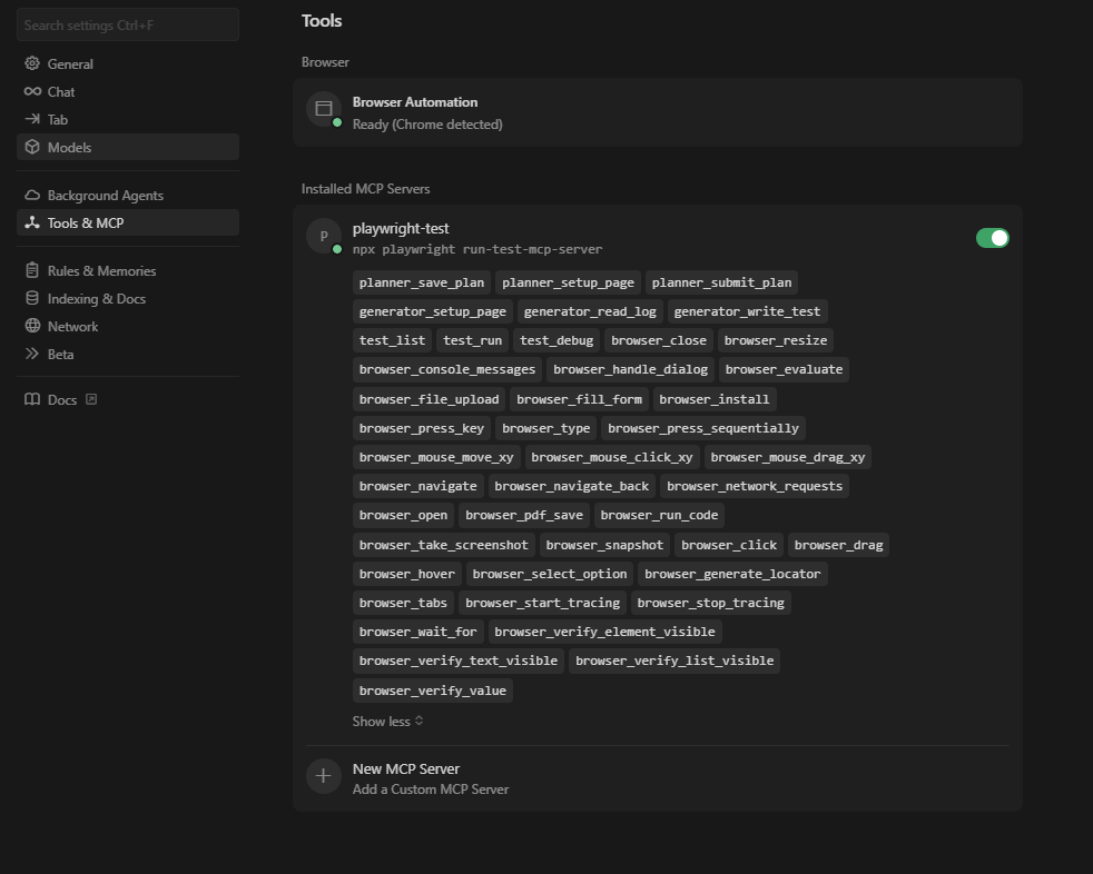 If you use Cursor, add the server in MCP settings and point it to the Playwright MCP command.