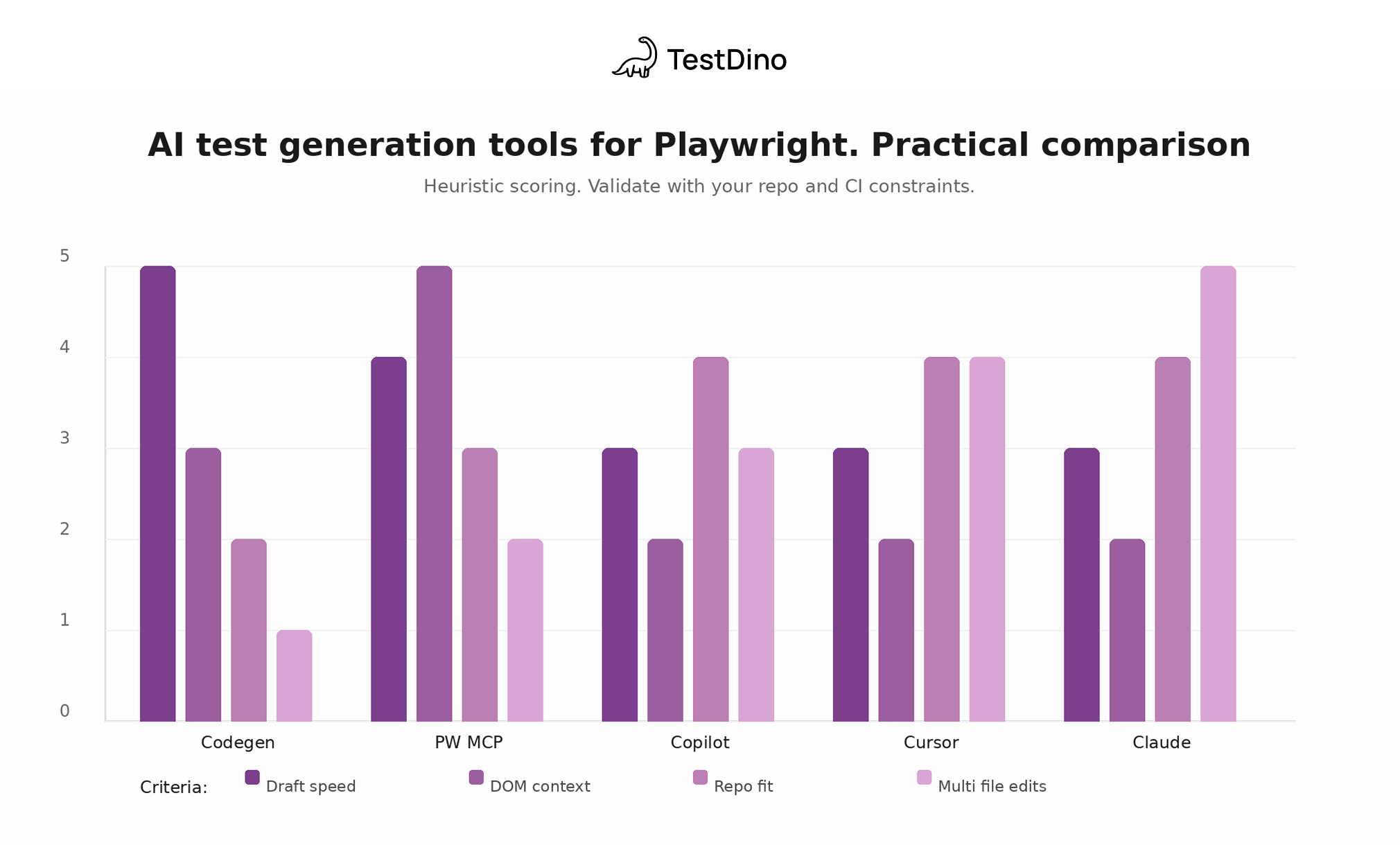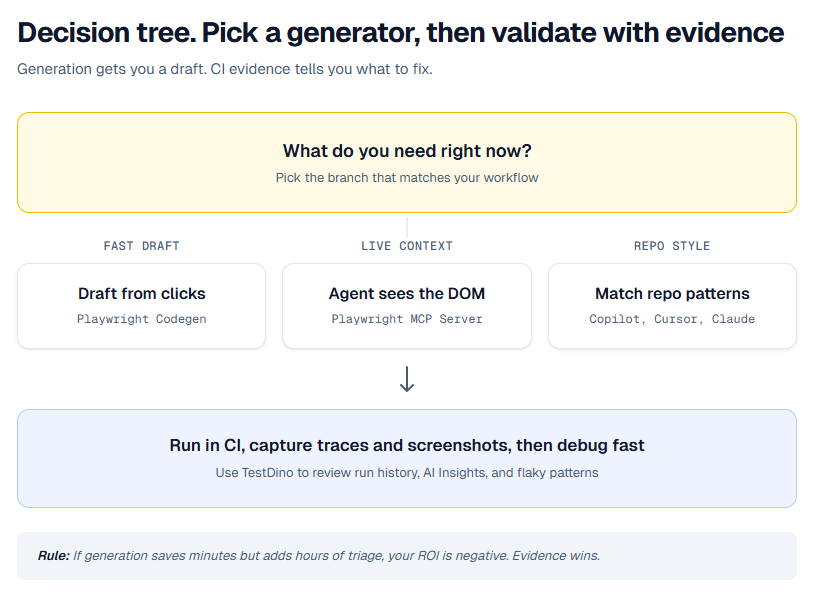| IDE copilot | New specs, refactors, fixtures, helpers | Copilot and Cursor | Guessed selectors, unstable waits, hidden shared state |