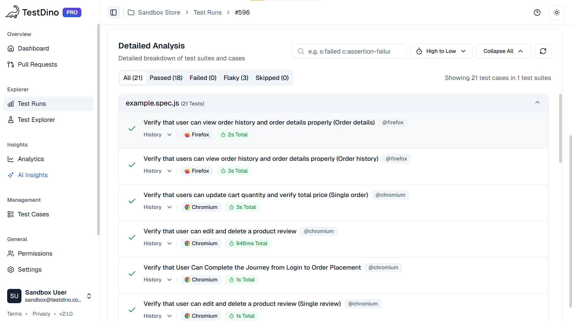 Run the PR in CI and review failures in TestDino AI Insights. If AI Insights flags flaky patterns or repeated timeouts, fix the waiting strategy and shared state before adding more tests.