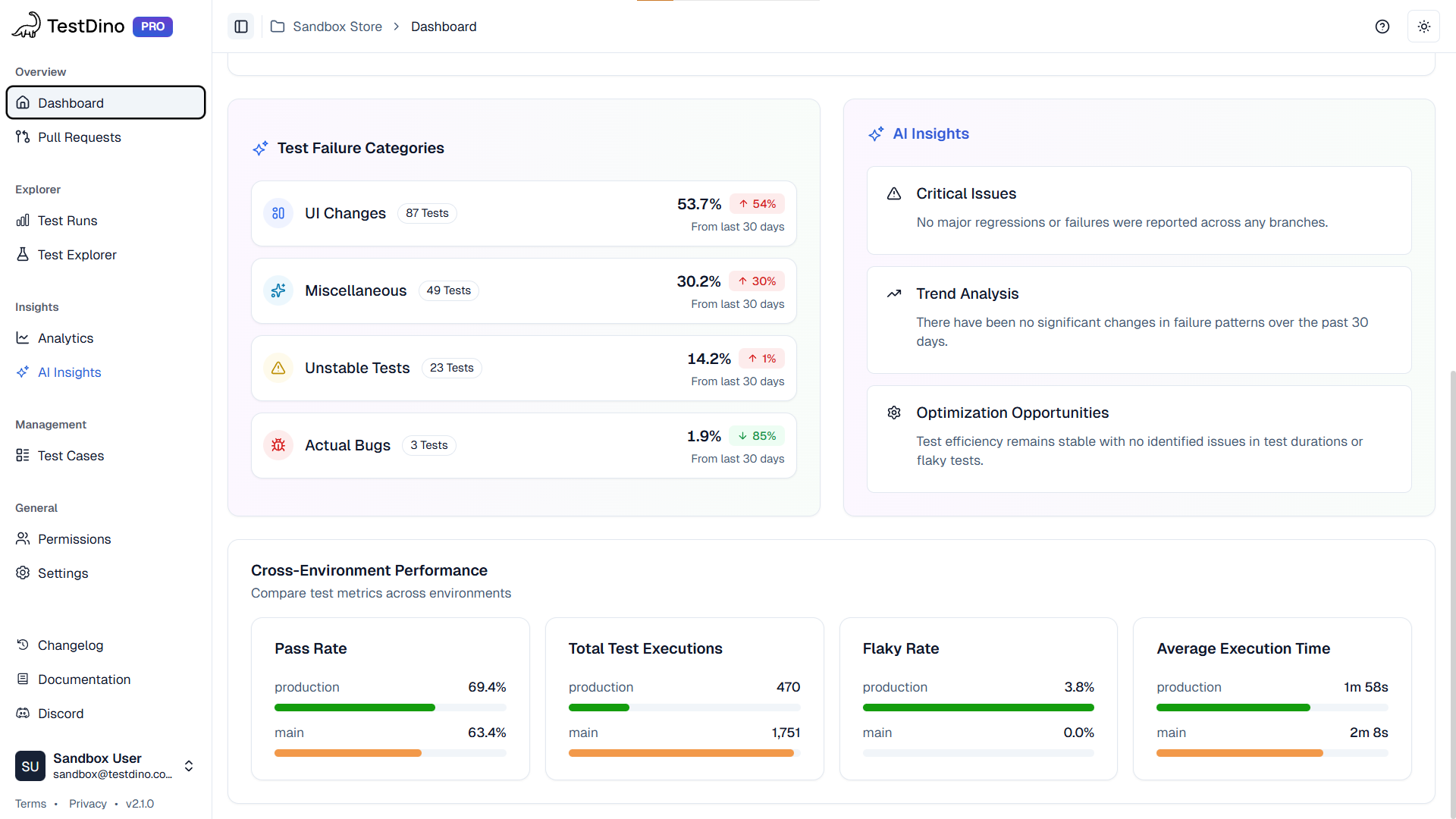 TestDino auto-detects flakiness, categorizes root causes, tracks patterns over time.