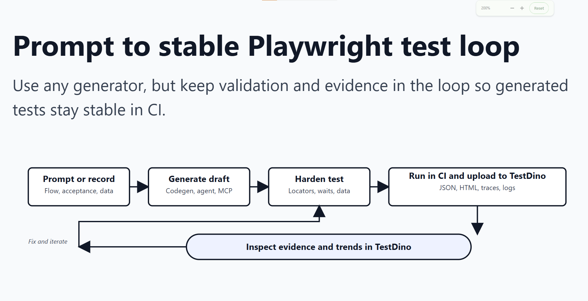 Generate. Run in CI. Collect trace and screenshots. Fix the real root cause. Repeat.