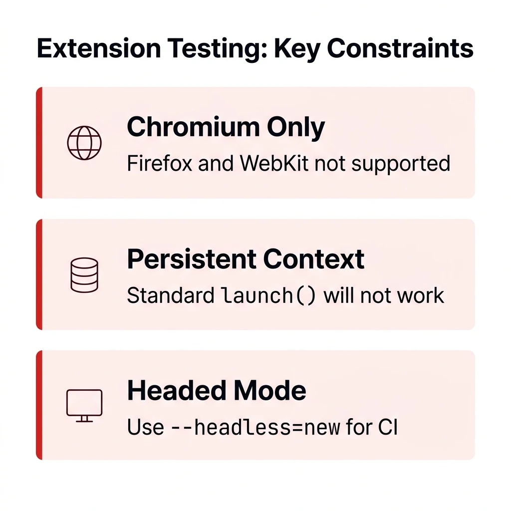 Unlike standard page testing where you simply call browser.newPage(), extension testing requires a persistent browser context. This is because extensions attach to the browser profile at launch time, not to individual tabs.