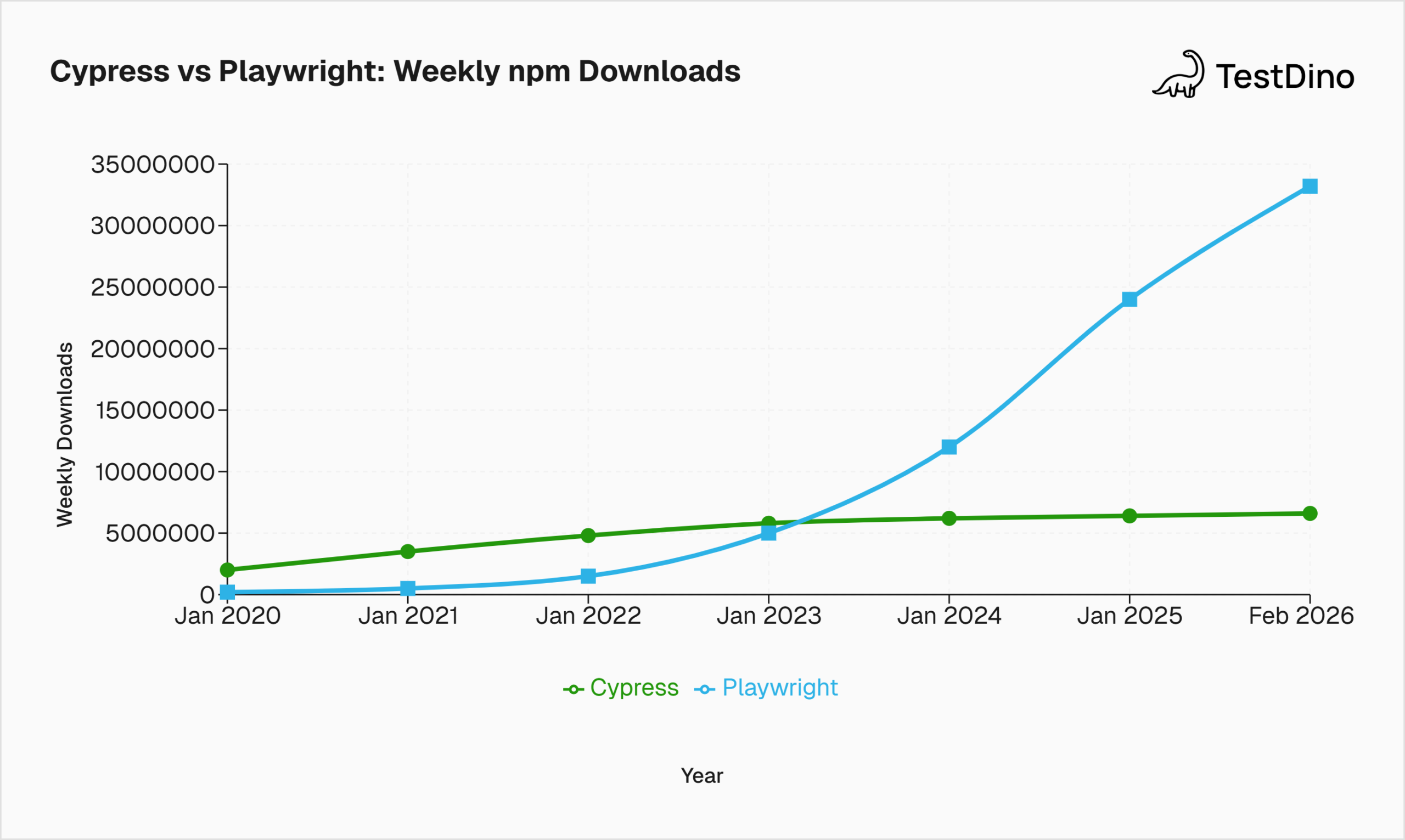 - 2025-2026: Cypress holds at ~6.5M. Playwright crossed 20M in mid-2025 and hit 33M by early 2026. The gap widened significantly.