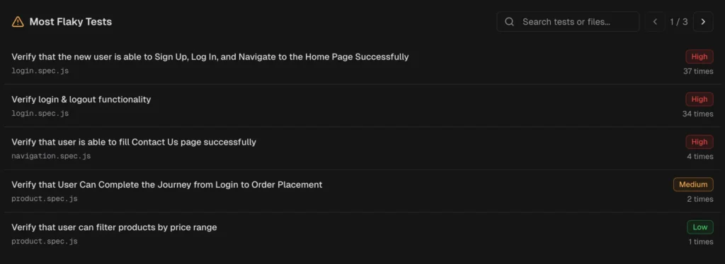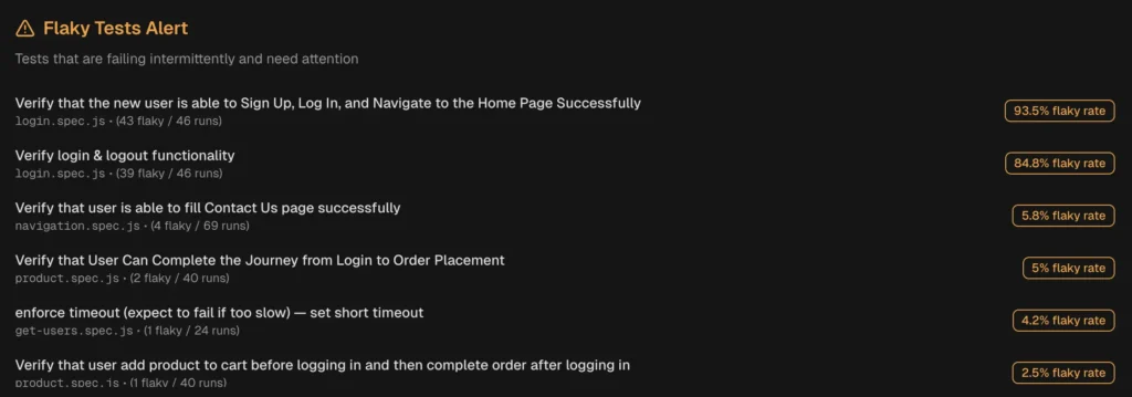 | Which tests flake the most | QA Dashboard ranks tests by flaky rate percentage with direct links to the latest run |