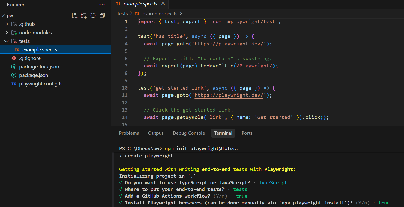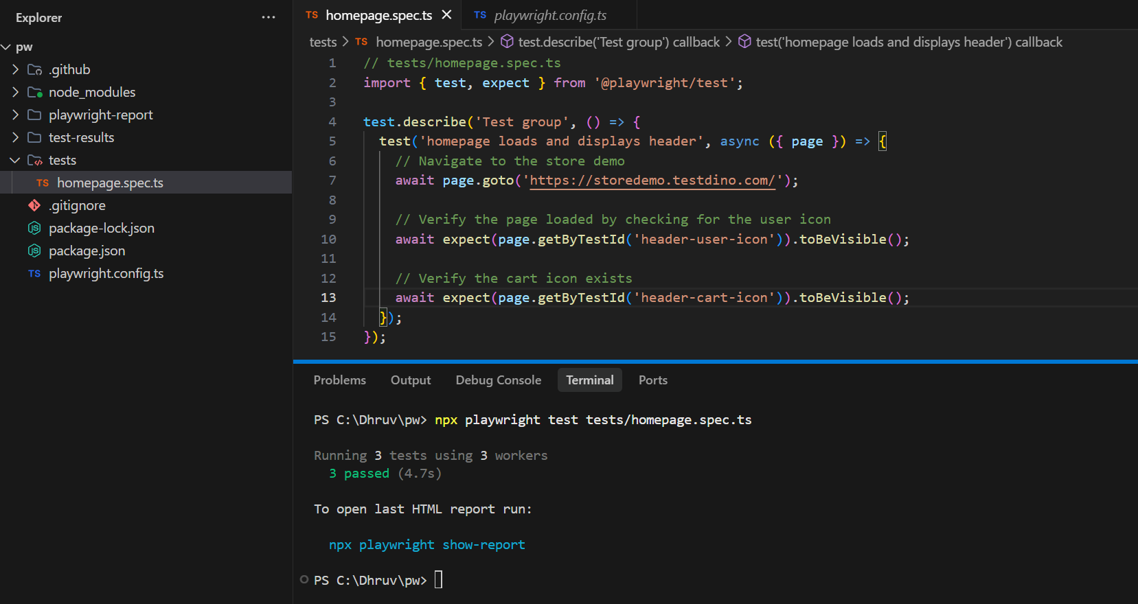 After this step: You have a working Playwright project with example tests that run and produce a report.