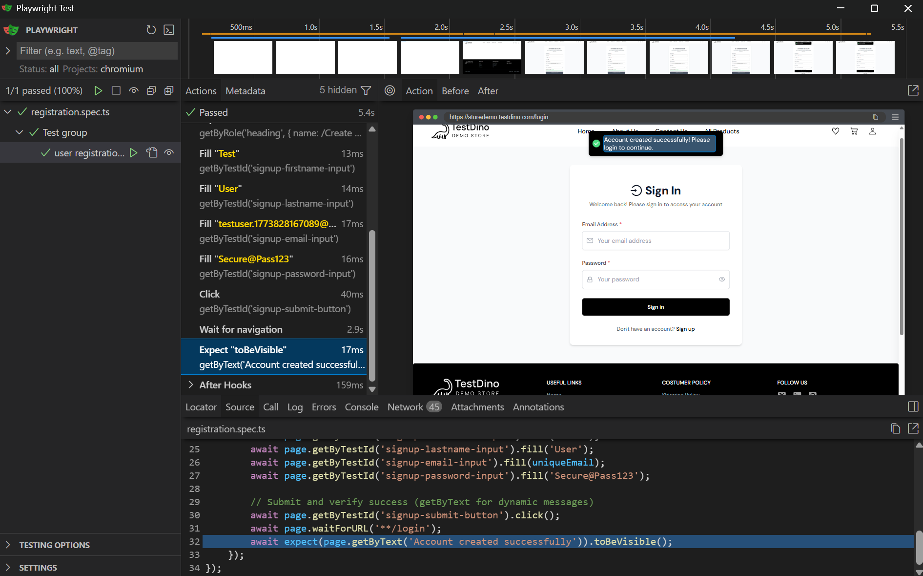 After this step: When a test fails, you have DOM snapshots, network logs, and screenshots to find the root cause.
