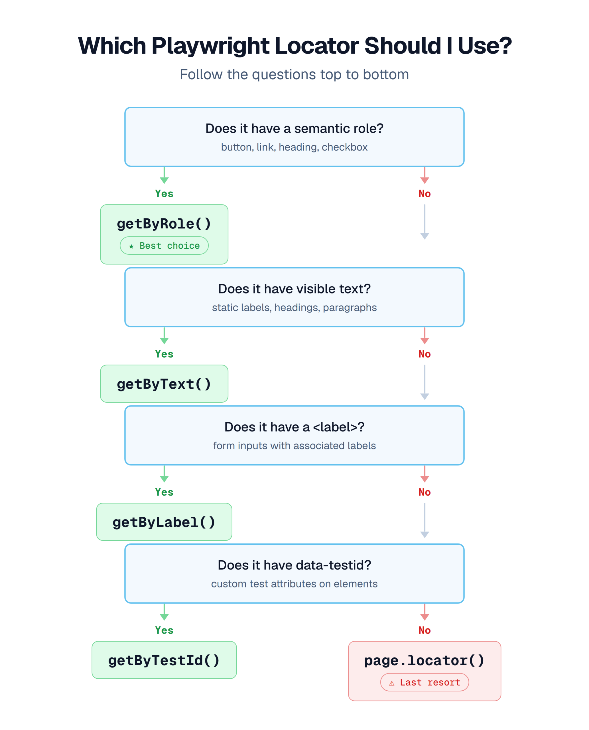 This is the step that separates shaky tests from reliable ones. Playwright's locator documentation recommends this priority order: