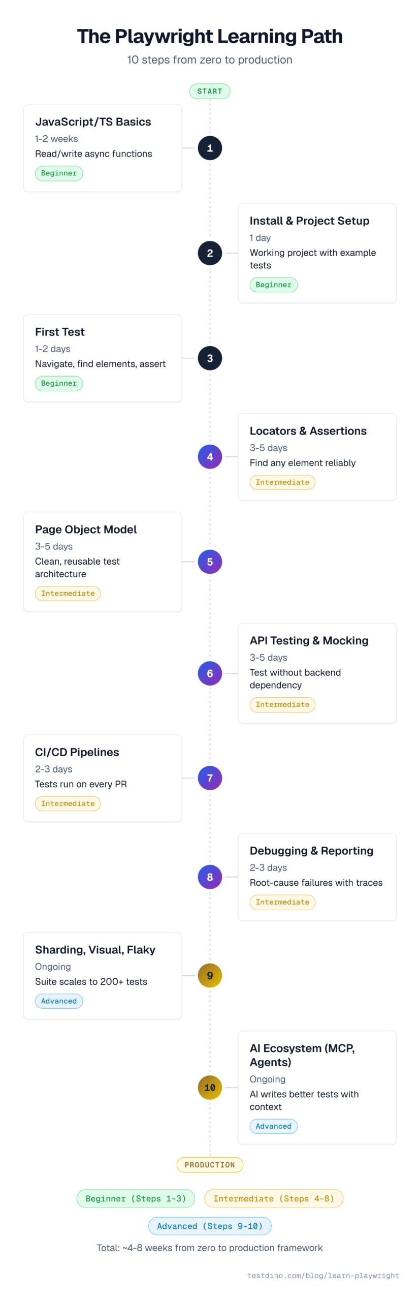10-step roadmap to learn Playwright from zero to production. Working code, time estimates, and clear checkpoints at every step of the way.