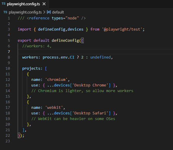 Tip: You can override the config from the command line with npx playwright test --workers 4. The CLI flag takes precedence over the config value, which is handy for quick local experiments without editing the file.