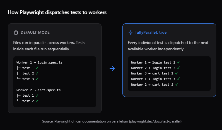 Enabling fullyParallel changes this. It tells the runner to treat every individual test as a separate unit, dispatching each one to the next available worker.
