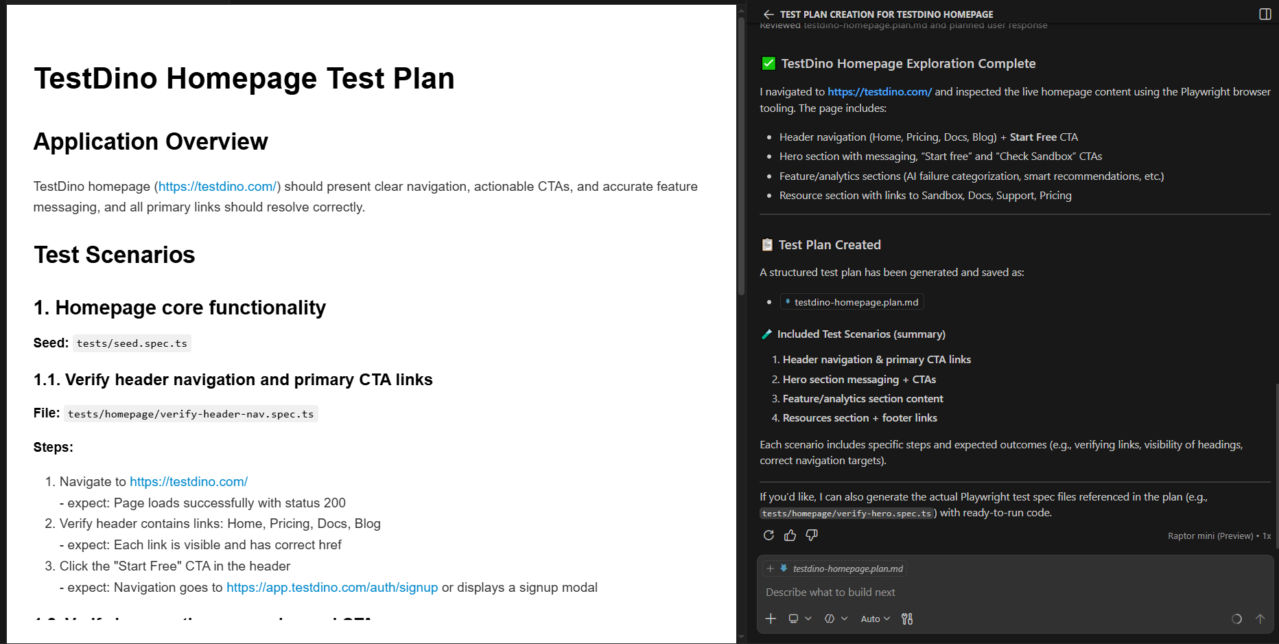 The Planner outputs a testdino-homepage-plan.md file with scenarios, steps, and expected outcomes.