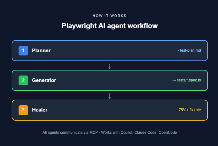 Note: All three agents communicate using MCP. They work with AI coding assistants like GitHub Copilot, Claude Code, and VS Code's built-in agent mode. You initialise them with npx playwright init-agents and choose your integration loop: vscode, claude, or opencode.