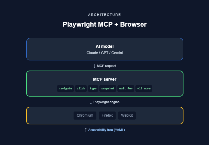 The protocol layer : Playwright MCP (Model Context Protocol) gives AI models a controlled, standardised way to interact with a live browser session through structured tools and accessibility snapshots.