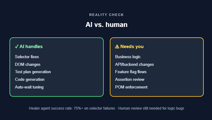 According to Microsoft's published benchmarks, the Healer agent achieves a success rate exceeding 75% on selector-related failures. For complex logic bugs or significant architectural changes, human review is still required.