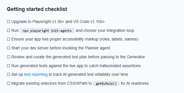 Tip: Playwright's recommended getByRole() locator strategy already queries the accessibility tree. If your existing tests use role-based locators, they're naturally aligned with how Playwright AI agents work. Migrating from CSS/XPath selectors to role-based locators is the single most impactful step for AI readiness.