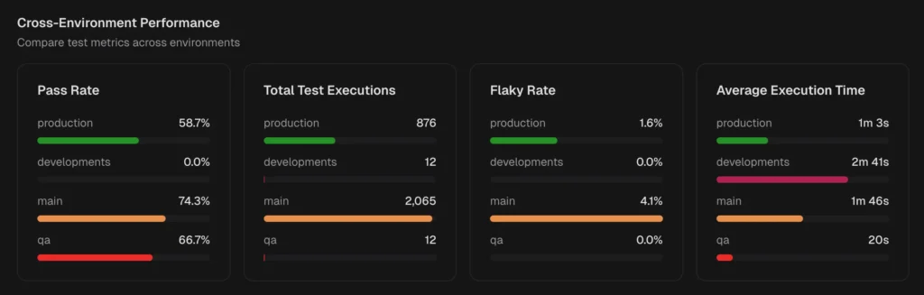 Cross-environment comparison showing whether a test is flaky everywhere or only on specific CI runners