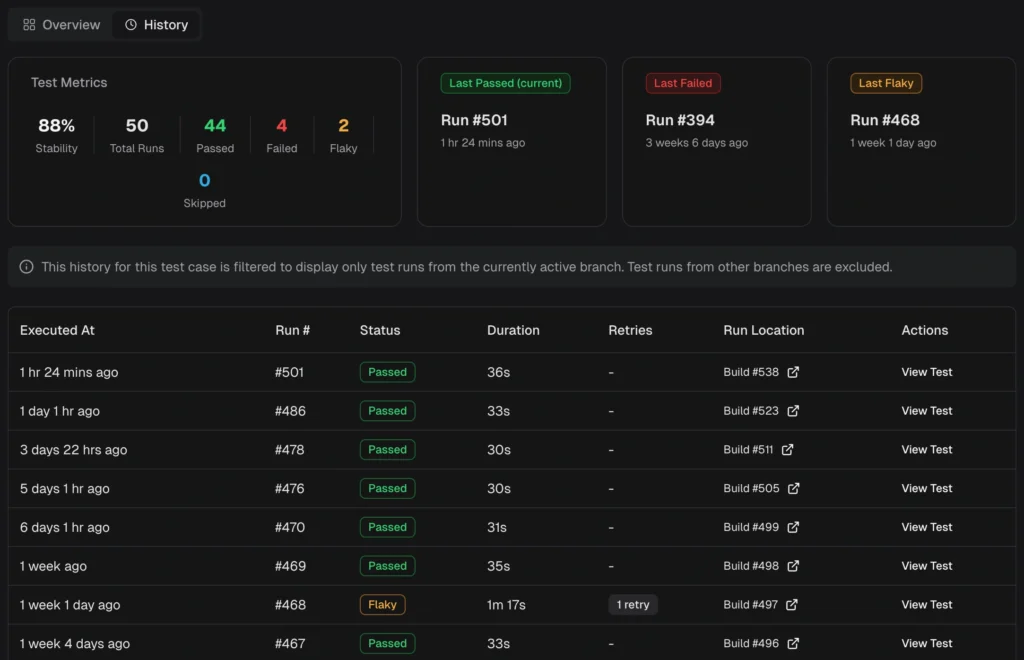 Without historical tracking, you can't distinguish a flaky test from a legitimate failure. Teams resort to rerunning pipelines, hoping the failure will go away.
