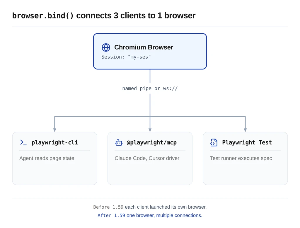 browser.bind() is the feature that quietly enables multi-client workflows. It makes a launched browser available to Playwright-CLI, @playwright/mcp, and any other Playwright client simultaneously.