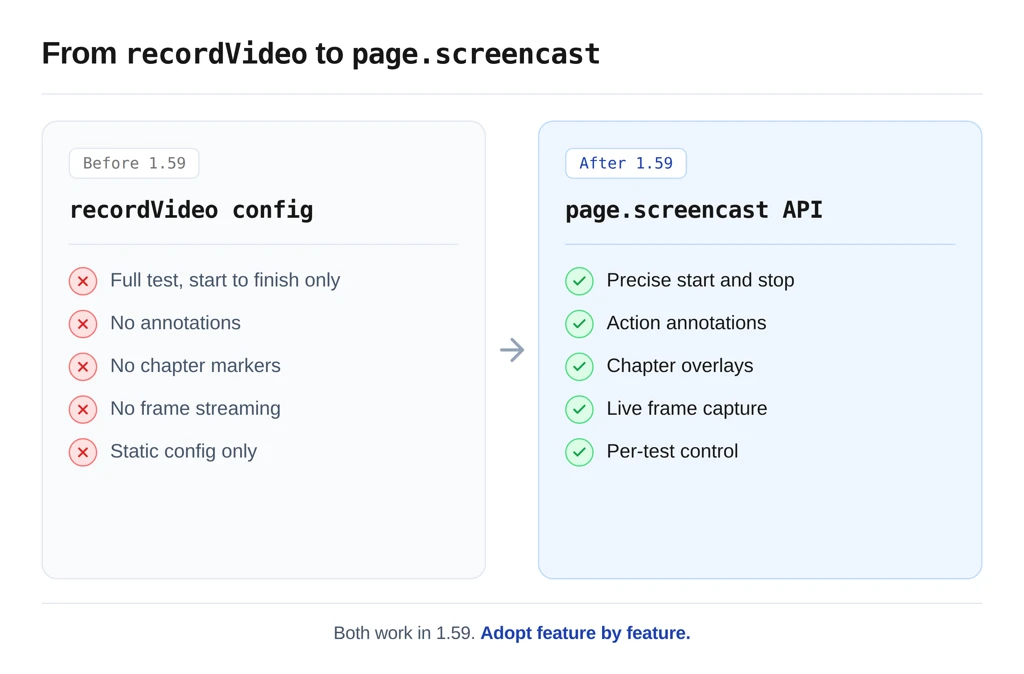 Every other 1.58 script still runs. The old recordVideo option keeps working, so you can adopt page.screencast feature by feature.