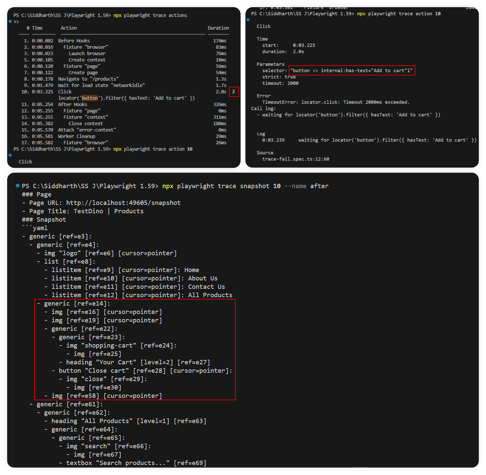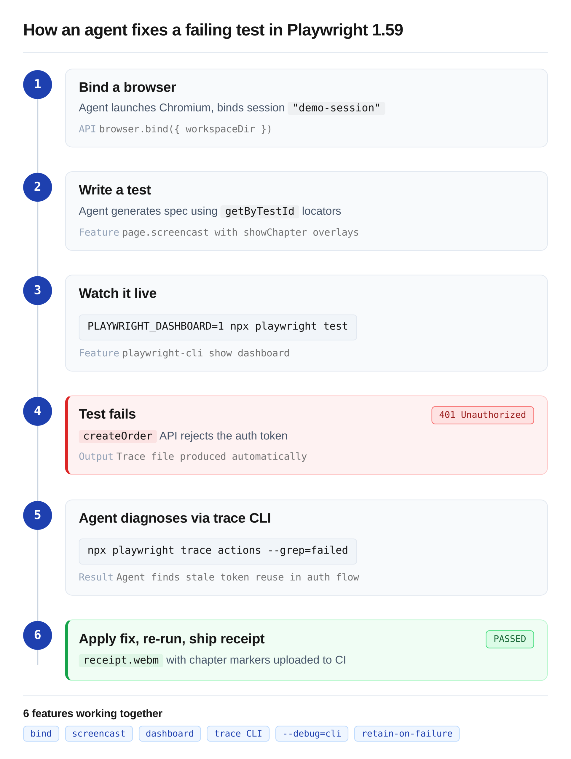 This guide walks through every 1.59 feature with code you can copy into a real Playwright + MCP project, plus one worked end-to-end demo where an agent fixes a failing test on its own.
