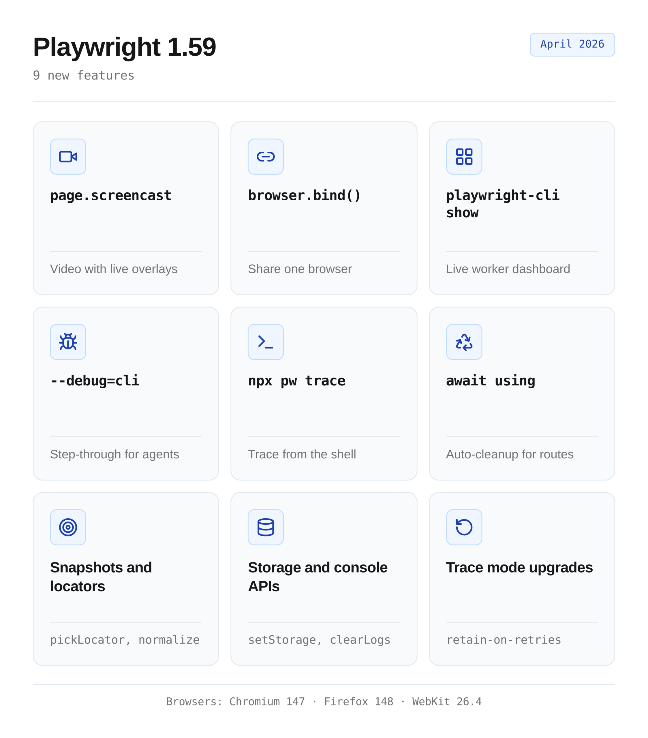 Playwright 1.59 adds page.screencast, browser.bind, a trace CLI, await using, pickLocator, and more. Check out the features with their working code samples.
