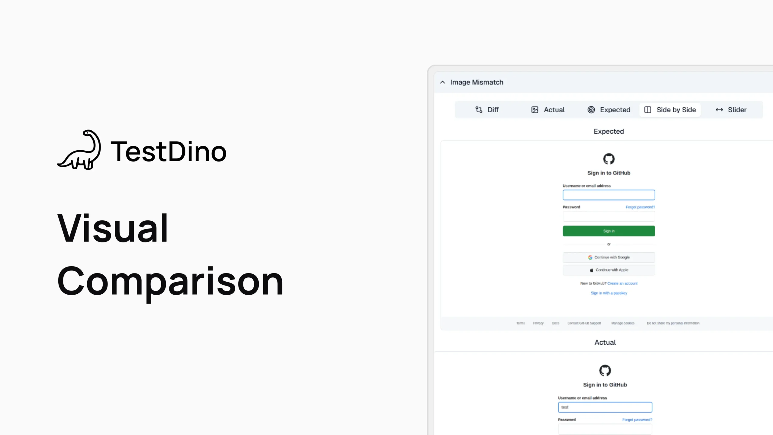 | Side by Side | Expected and actual in two panes | Compare at a glance, scans across elements |