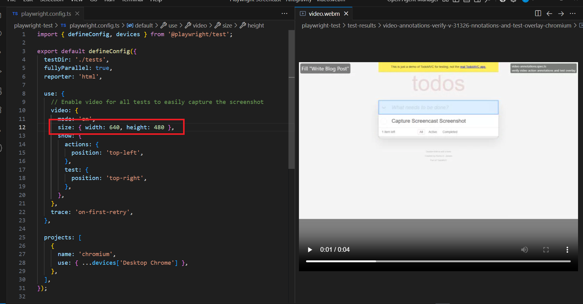 Starting with v1.59, you can pass an object instead of a string to control video dimensions and enable visual overlays directly from the config. The show property adds action annotations and test info overlays without writing any screencast API code.