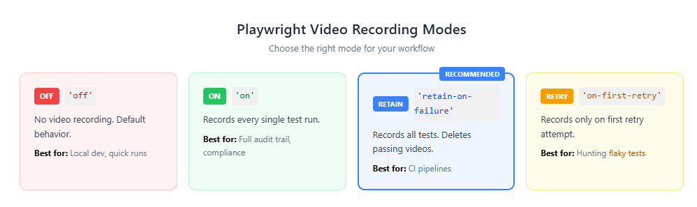 Playwright gives you four recording modes through the video option in your config. Each mode controls when test videos are captured and whether they are deleted afterward.