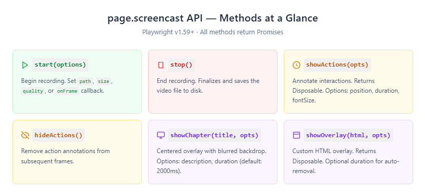 And as of Playwright v1.59, screencast recording is no longer just a passive dump. The new page.screencast API lets you start and stop recordings mid-test, annotate interactions visually, insert chapter markers for narration, stream frames to AI vision models in real time, and produce video receipts that coding agents can hand off for human review.