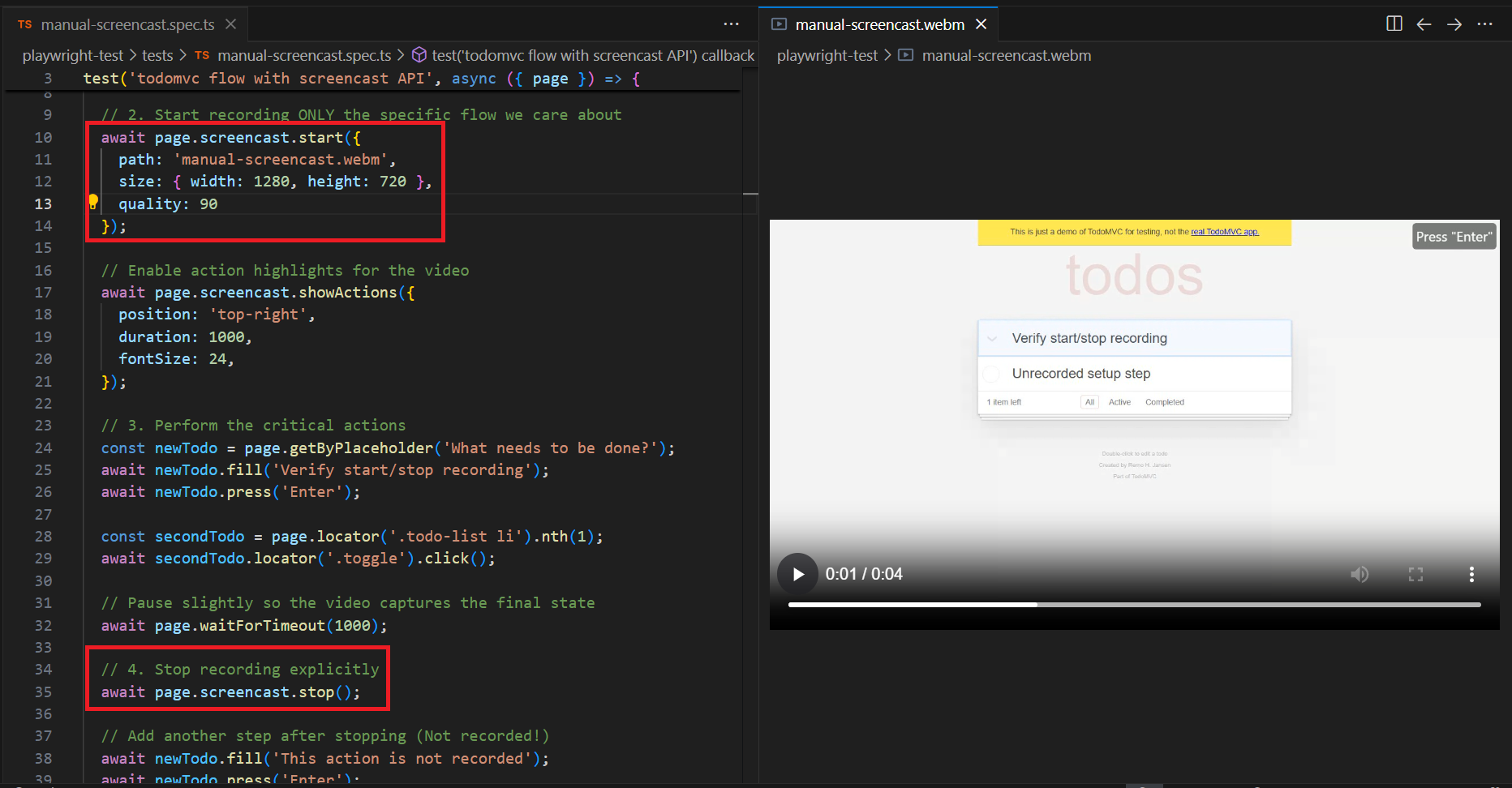 3. Use the screencast API for focused recordings. With page.screencast, you only record the section you care about. Skip the setup and teardown:
