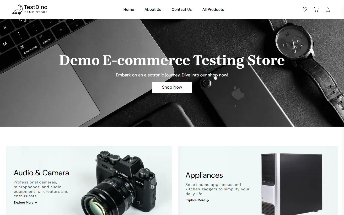 - Homepage with hero banner, product categories (Audio & Camera, Appliances, Gadgets, PC & Laptops), and a featured product carousel