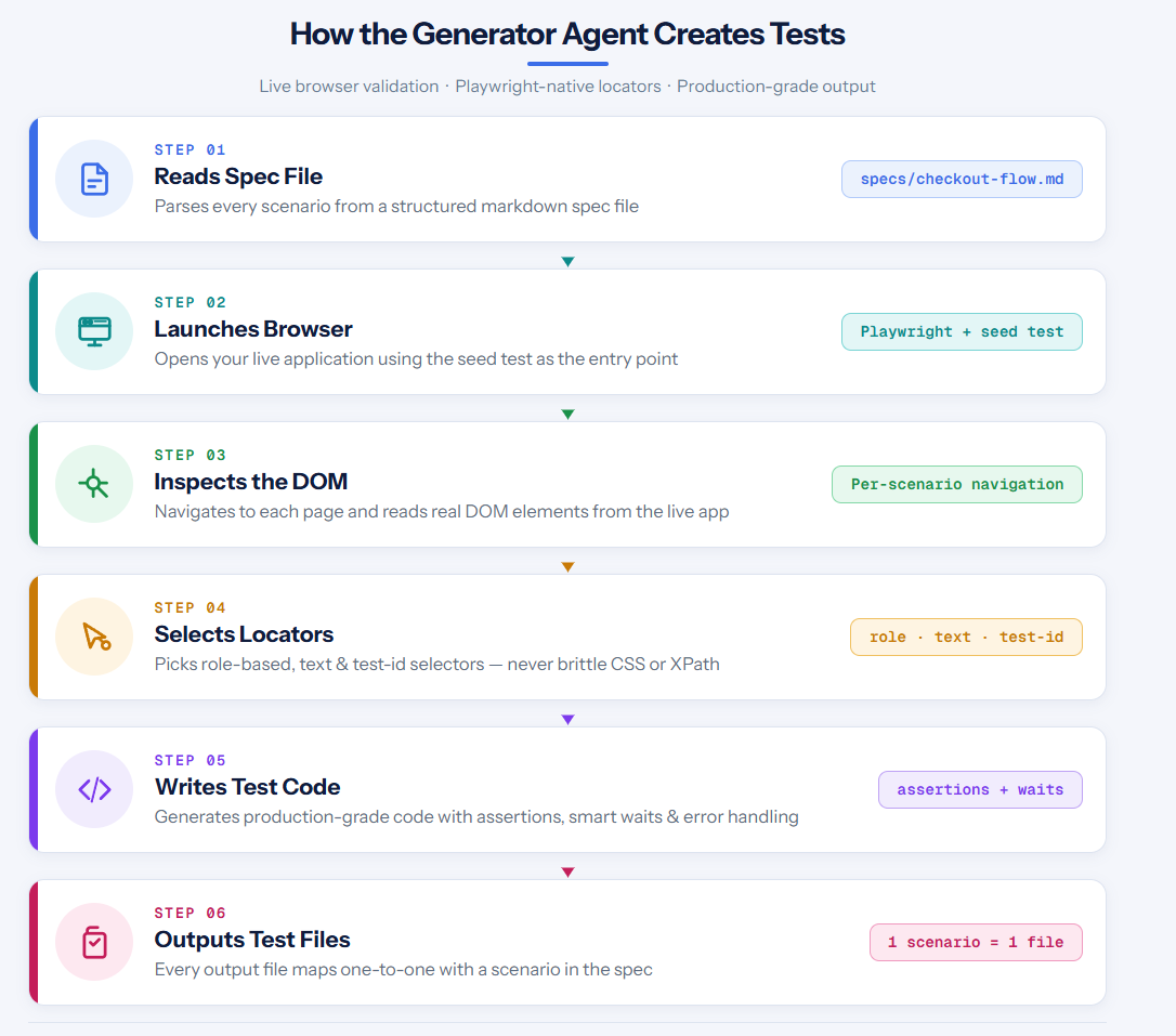 - Generator reads a spec file (for example, specs/checkout-tests.md)