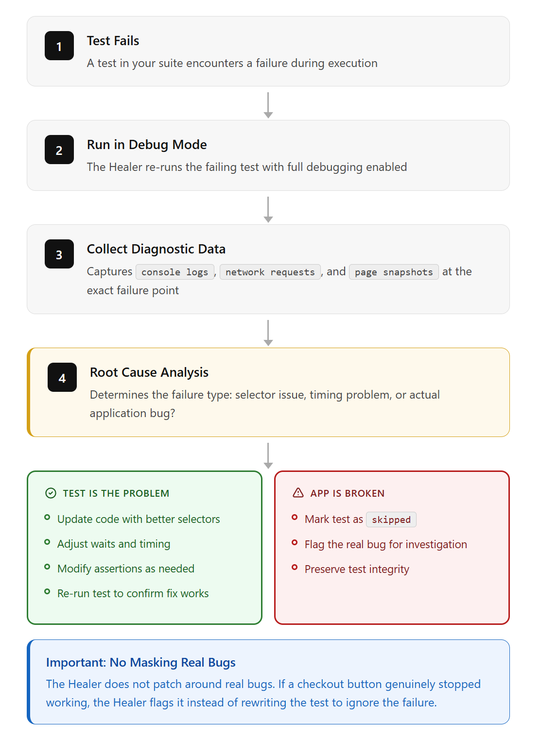 If a redesign changes the entire user flow, not just a selector, the Healer can't redesign the test. It fixes locators. It doesn't rewrite test logic.