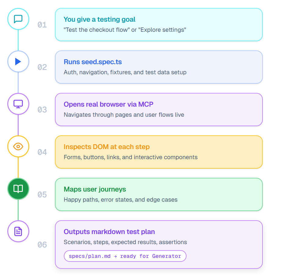 The Planner doesn't ask you to list every test case upfront. It explores your application the way a QA engineer would during an exploratory session, except it does it systematically and documents everything.