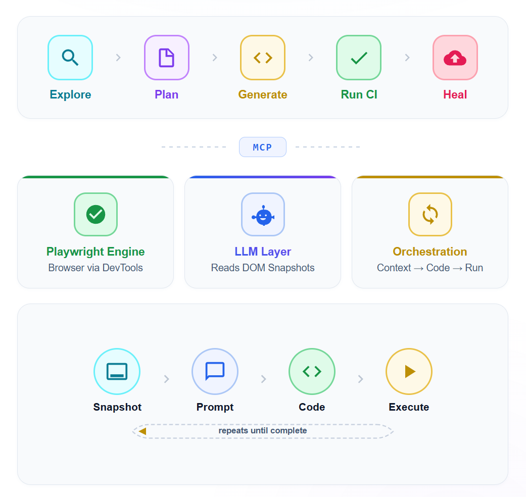 Playwright agents use the Model Context Protocol (MCP) to connect a large language model with a real browser. The AI doesn't guess what the page looks like. It interacts with the actual application, observes live DOM state, and makes decisions based on real behavior.