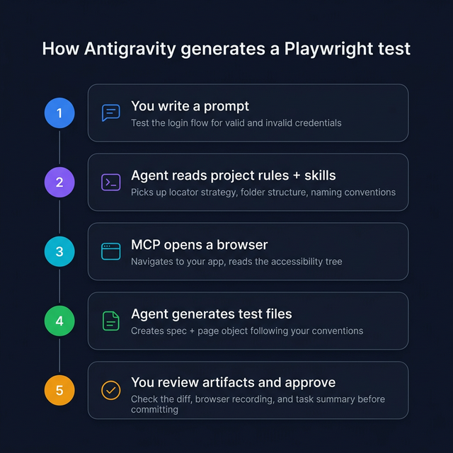 Antigravity reads these skill files automatically when they exist in your project. This means every test the agent generates follows your team's conventions without you repeating instructions.