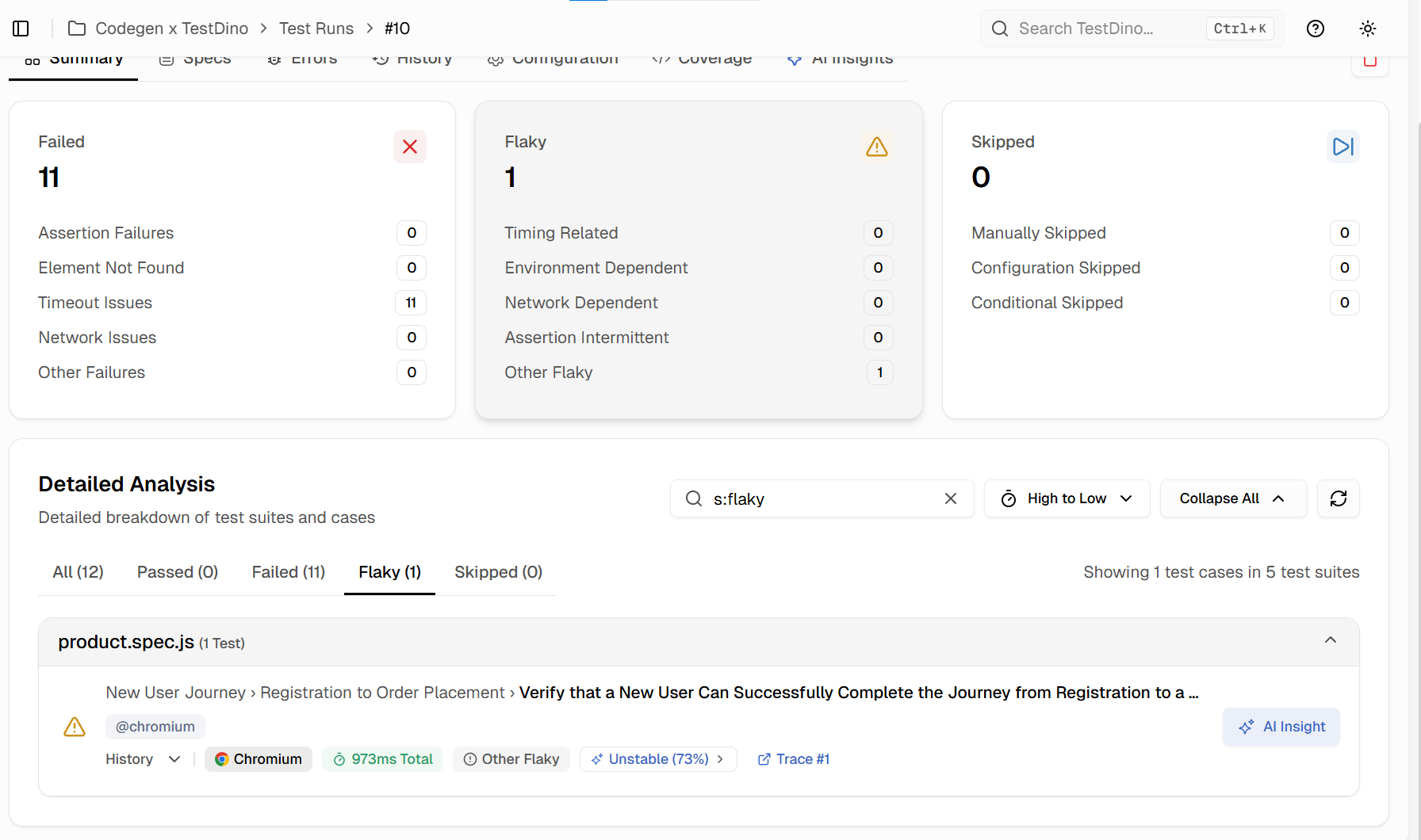 - Flaky test detected. TestDino flags cart-flow.spec.ts as flaky (passed 7 of 10 recent runs).