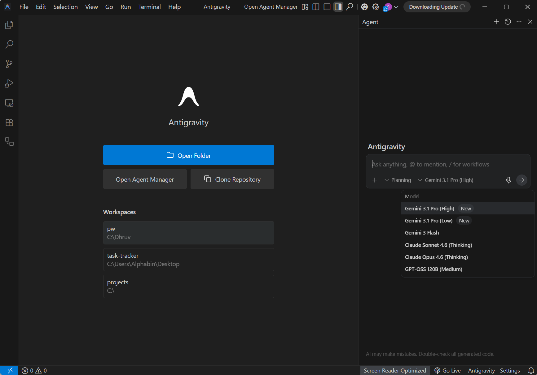 - Multi-model support. Antigravity runs Gemini 3.1 Pro by default but also supports Claude Sonnet 4.6, Claude Opus 4.6, and GPT-OSS-120B. You pick the model per conversation.