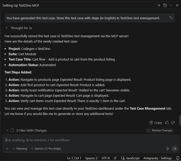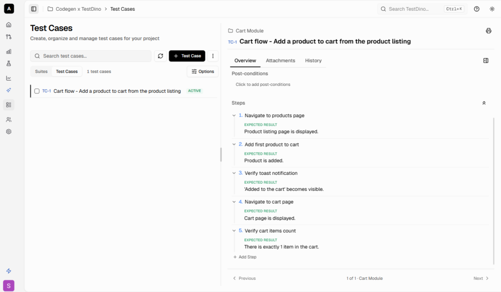 TestDino's Test Case Management tab is a standalone workspace where teams create, organize, and maintain all their manual and automated test cases within a project. As you generate tests with Antigravity, you can track them inside TestDino to keep your coverage organized.