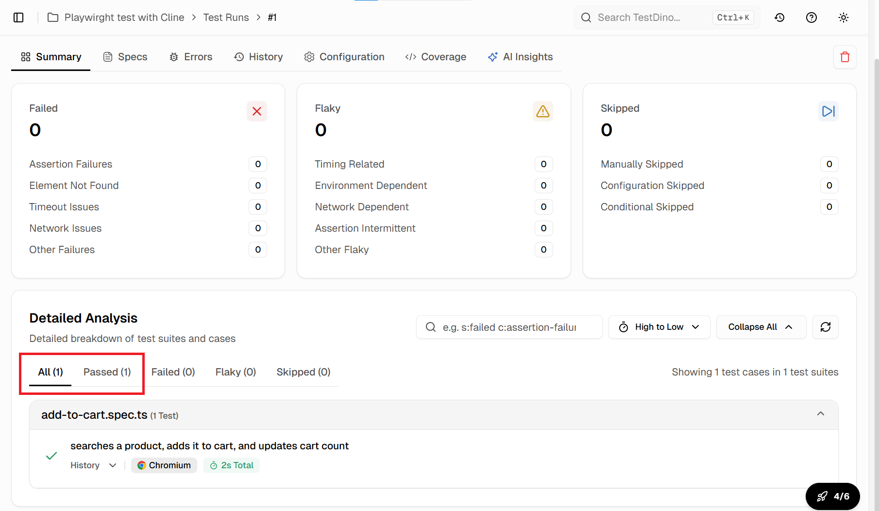 If your org exposes a TestDino MCP integration, adding it alongside Playwright MCP can give Cline historical failure context. Configure a second entry in cline_mcp_settings.json only after secrets and compliance review.