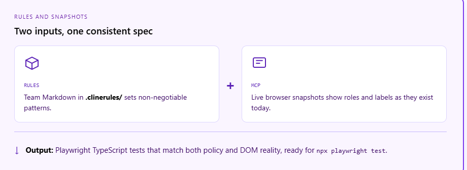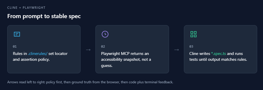 Without MCP, Cline only knows what you type. With MCP, it can navigate, snapshot the accessibility tree, and ground locators in the current DOM. That lines up with how the accessibility tree makes automation more stable than raw CSS alone.