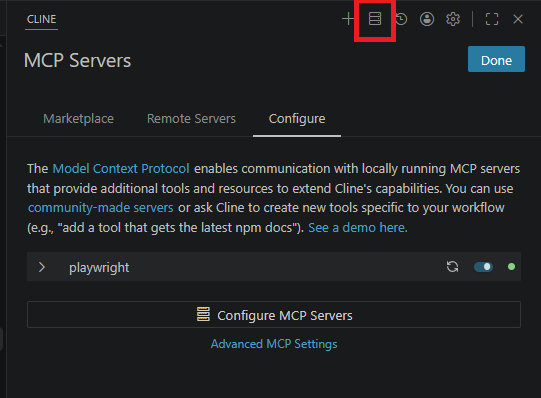 Cline MCP panel showing Playwright server connected. Capture: VS Code with Cline open, MCP Servers list, playwright entry enabled, green or active status. How: Open MCP Servers, expand your Playwright server, screenshot after a successful restart. Place: Section "How to connect Playwright MCP to Cline," after the JSON example, to show readers the UI they should see.