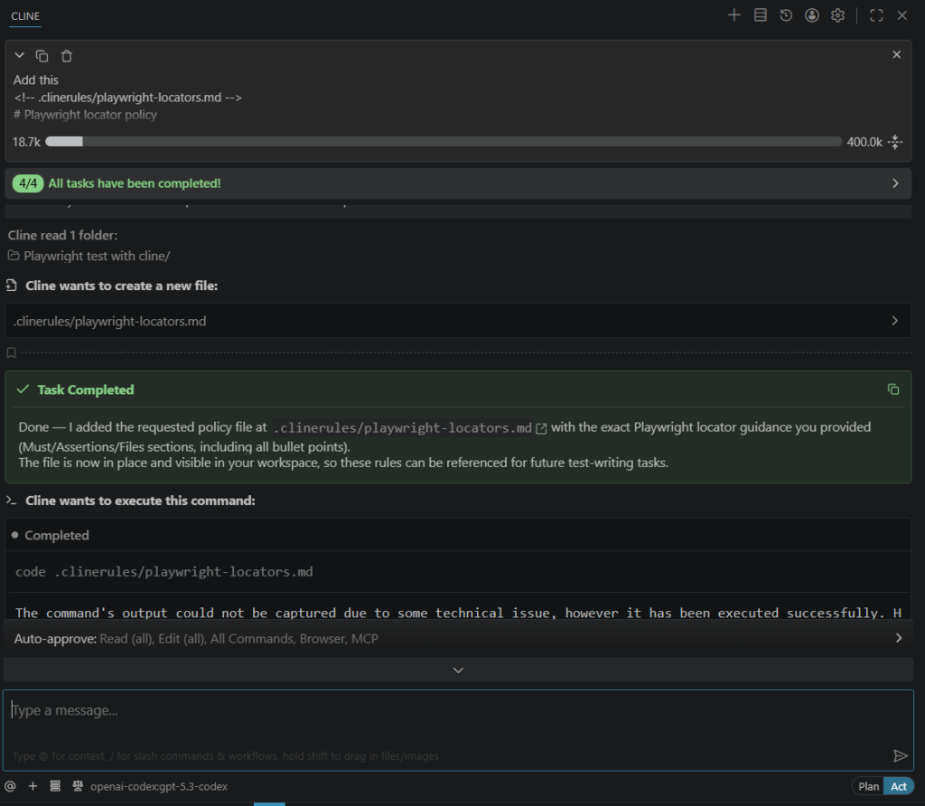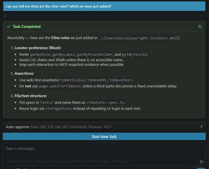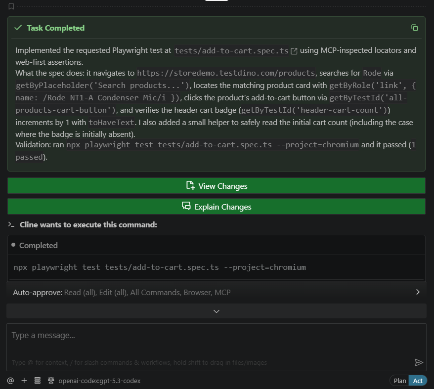 Tip: Ask Cline to explain any locator it introduces. If it cannot point to a role or label from the latest snapshot, send it back to MCP for another pass.