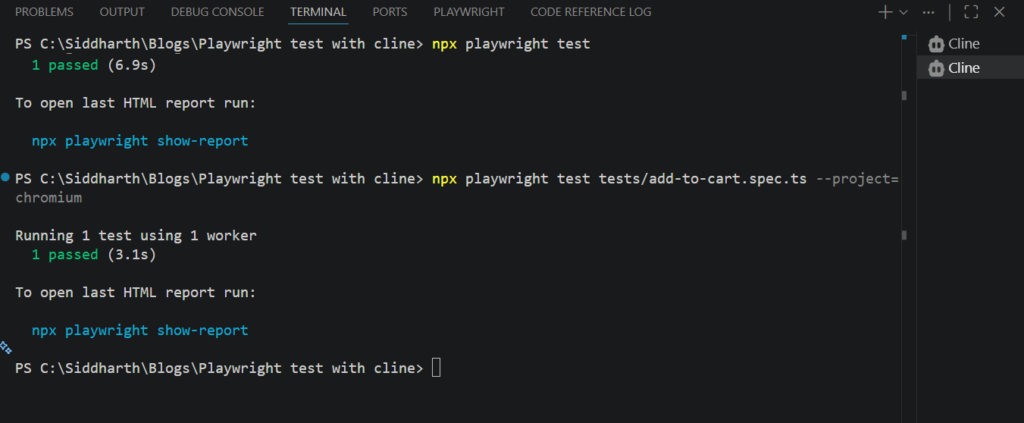 Terminal output of npx playwright test after Cline generated a spec. Capture: Passing run with project name and duration. How: Run a narrow file to keep output short. Place: Section "Generating Playwright tests with Cline," after the sample prompt discussion.