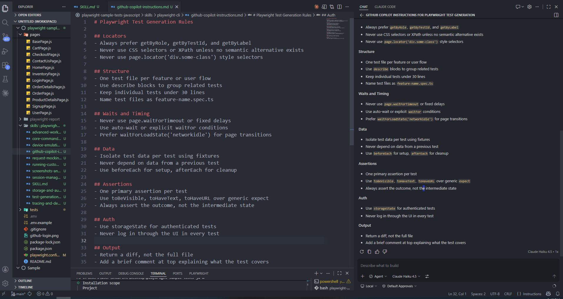 Skills give the agent general Playwright knowledge. .github/copilot-instructions.md gives it your team's specific conventions. Without instructions, Copilot will invent its own structure, and every generated test will look different.