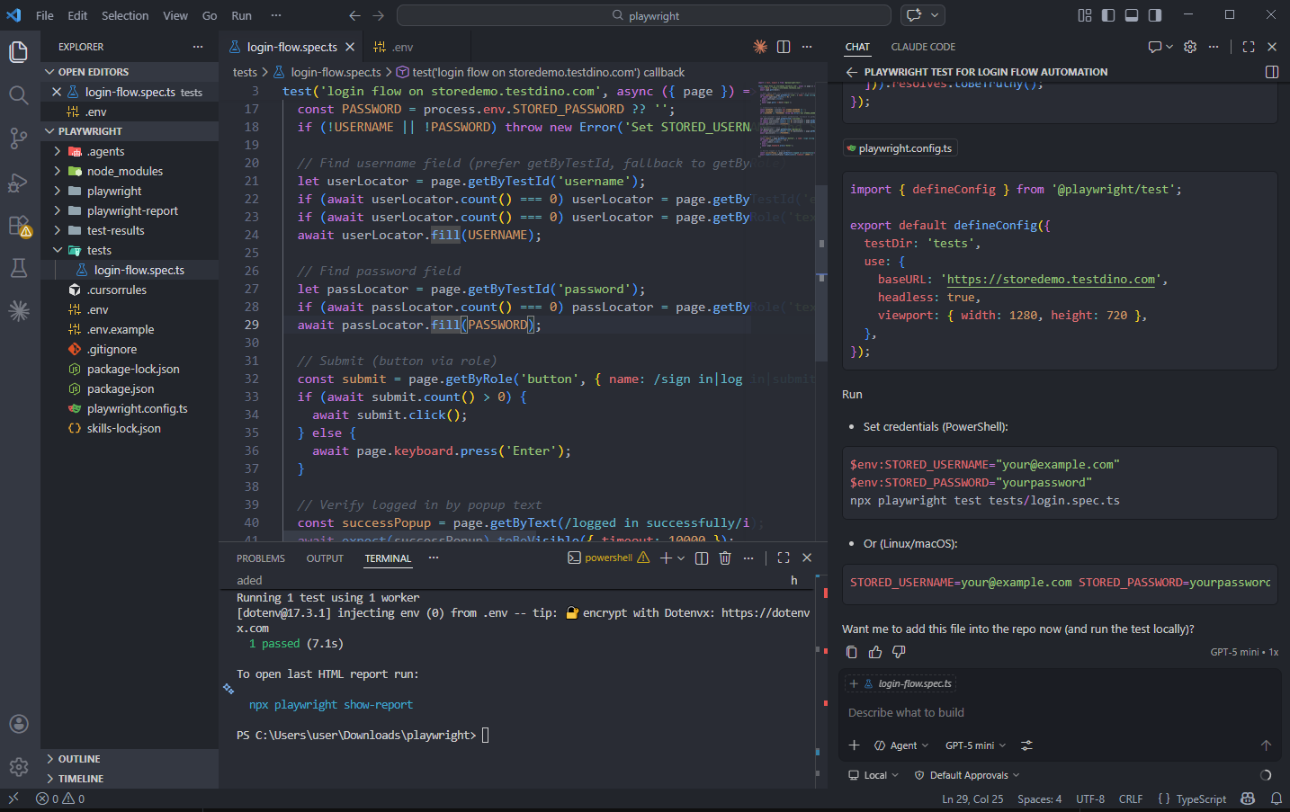 Using Playwright CLI Generate a Playwright test for the login flow on https://storedemo.testdino.com.