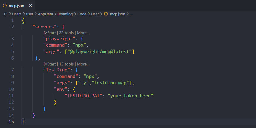 Add TestDino MCP to your VS Code configuration. Open .vscode/mcp.json and add: