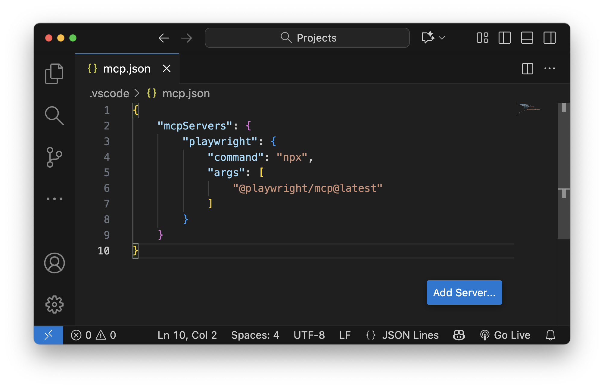 Next, create a .vscode/mcp.json file in your project root. VS Code and GitHub Copilot pick this up automatically: