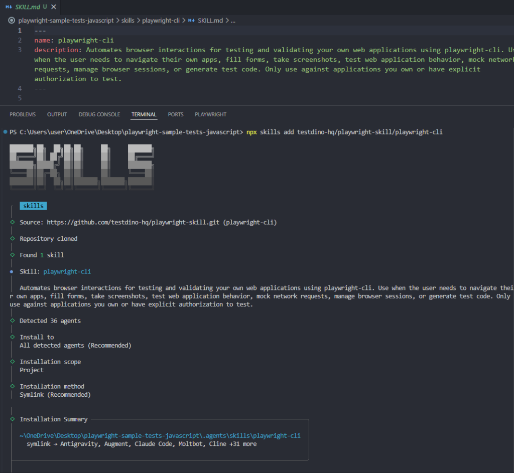 The difference is noticeable. Without the Skill loaded, an AI agent generates tutorial-quality code with brittle CSS selectors. With the Skill, it uses getByRole() locators, proper wait strategies, and structured test patterns that actually pass against real sites.