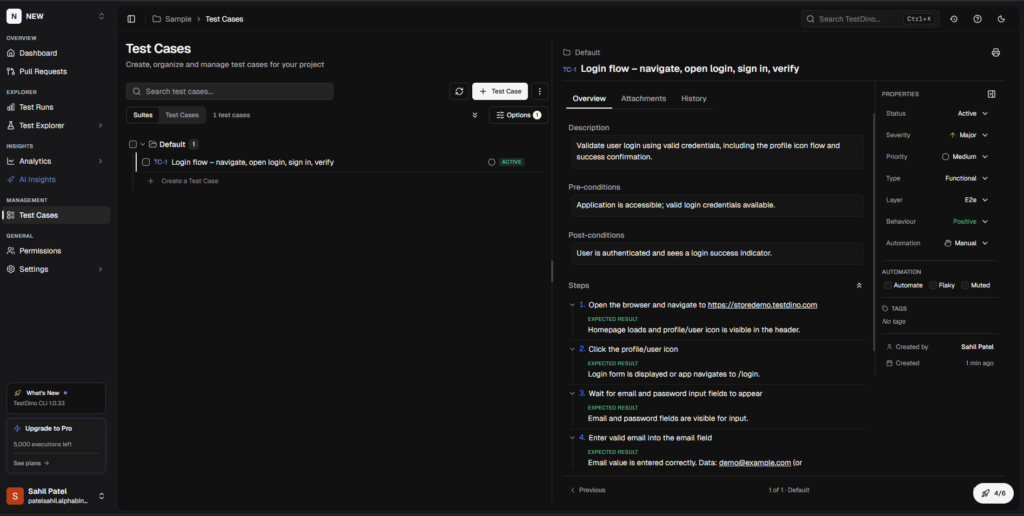 TestDino's Test Case Management tab is a standalone workspace where teams create, organize, and maintain all their manual and automated test cases within a project. As you generate tests with GitHub Copilot, you can track them inside TestDino to keep your coverage organized.